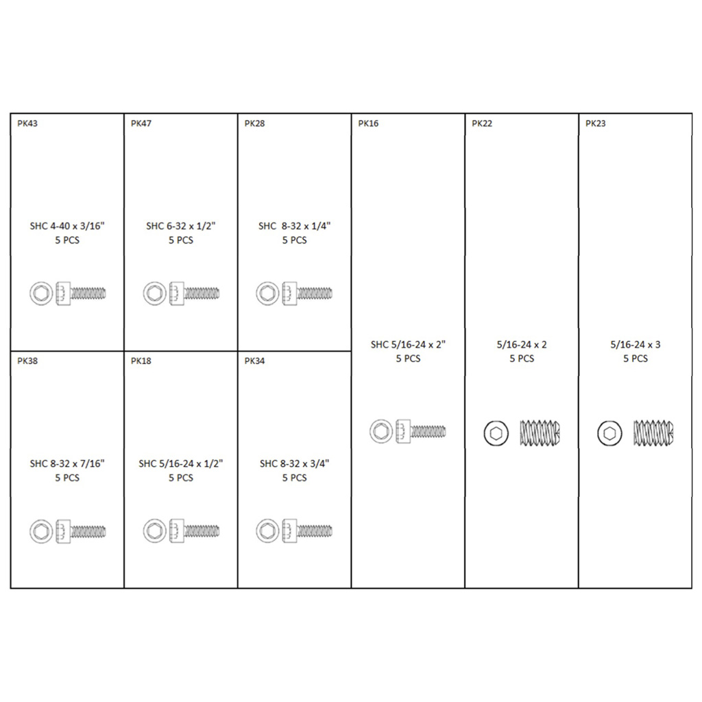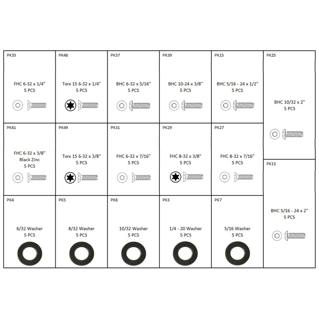 The PRO parts kit is a 3 box set loaded with a variety of screws, bolts, stabilizer studs, washers, cam spacers, e-clips, bolt spacers and much more in large assortment of sizes. It?s the perfect kit that will supply the lost part you can never seem to find. Each box is equipped with a guide that will tell you the exact size and name of each part that’s inside the kit. Kit includes a thread gauge, basic parts kit with 310 pieces, parts kit 2 with 85 pieces and parts kit 3 with 45 pieces for a total of 440 pieces.